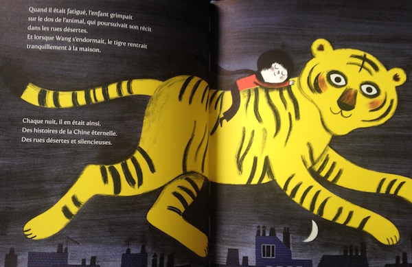 Il était une fois un petit garçon prénommé Wang et qui, la nuit tombée, se faufilait hors du restaurant familial pour aller se promener dans les rues désertées de Paris, en compagnie de son tigre, Ban-Ji (et pas Banh Mi, comme l’affamée que je suis l’avait lu. Oups). Pendant que l’enfant s’endormait sur le dos du tigre, ce dernier lui murmurait des histoires sur la Chine éternelle, la Chine de ses ancêtres. Un soir, Wang et Ban-Ji eurent la surprise de rencontrer madame Aminata (passionnée d'étoiles) et son crocodile Moboutou qui, eux, racontèrent au garçon des contes de leur Afrique natale et du fleuve Niger. Par une belle nuit étoilée, Moboutou se retrouva seul… madame Aminata avait pris la poudre d’escampette pour rejoindre les étoiles.