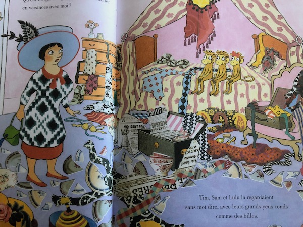 On retrouve avec un immense plaisir la plume légère et facétieuse de Quentin Blake et on se plonge avec ravissement entre les pages de l’album Les trois petits coquins en vacances, rythmé par la désormais culte (ou presque) ritournelle : « Mais les trois petits singes commencèrent vite à s’ennuyer… » « Tim, Sam et Lulu la regardaient sans mot dire, avec leurs grands yeux ronds comme des billes ». L’ingéniosité des trois singes pour transformer le paradis en enfer est toujours aussi délectable, et on s’amuse à retrouver les chapeaux plantés dans l’arbre à côté du portrait de l’arrière-grand-père, mais, surtout, à voir la Crevette détailler les bêtises avec son regard pétillant. Les illustrations d’Emma Chichester Clark sont toujours aussi merveilleuses et, fait que je n’avais pas remarqué dans l’album précédent (mais il semble que cela y soit déjà présent, après analyse approfondie des pages), mêlent quelques morceaux épars de collage (du moins me semble-t-il). Bref, cette étape analytique passée, reste le plaisir de lire cet album, encore encore et encore, avec la Crevette qui pointe du doigt et rigole de son rire en grelot. Comme le précédent album, Les trois petits coquins en vacances est une très chouette lecture, un joli coup de coeur qui pétille.