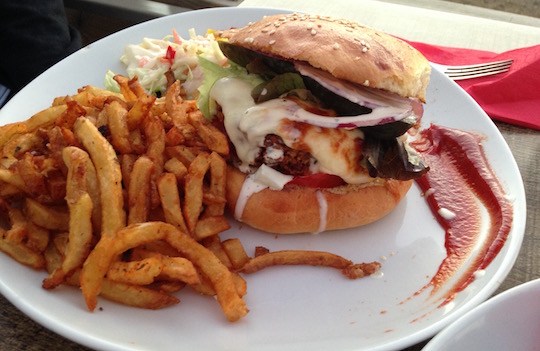 Devant mon enthousiasme (et, très honnêtement, il n’était pas en reste), l’homme m’a écouté et nous avons décidé de retourner au Café du port - Chez Marcel pour notre dernière soirée sur l’île. (Bon. Et nous voulions également mettre derrière nous le désastre culinaire que fut notre soirée passée au Pinocchio : changement de propriétaire oblige, c’était bigrement mauvais. Comment peut-on louper une pizza à ce point ? La question demeure !) La seconde fois, le charme a de nouveau opéré. Nous nous sommes installés sur la terrasse arrière, qui surplombe le plan d’eau jouxtant le port. Et nous avons pu assister, en grignotant des tapas végétariens (soyons honnête, même s’ils tiennent la route, ils ne valent pas leur prix et manquent singulièrement d’inventivité comparé au reste… néanmoins, les tapas normaux semblent plus originaux), au coucher d’un soleil rougeoyant. Une merveille. Comme nous avons de légères tendances mono-maniaques, nous avons repris le veggie burger du moment, accompagné d’un camembert rôti. Si le veggie était fidèle à lui-même et toujours aussi délicieux, le camembert rôti manquait d’un peu de fun. (Par exemple, le bistrot bordelais Le Chabrot sert son camembert rôti avec un coulis au piment d’Espelette en son centre, et c’est une chouette trouvaille. Juste comme ça. En passant. Je dis ça, je ne dis rien.)